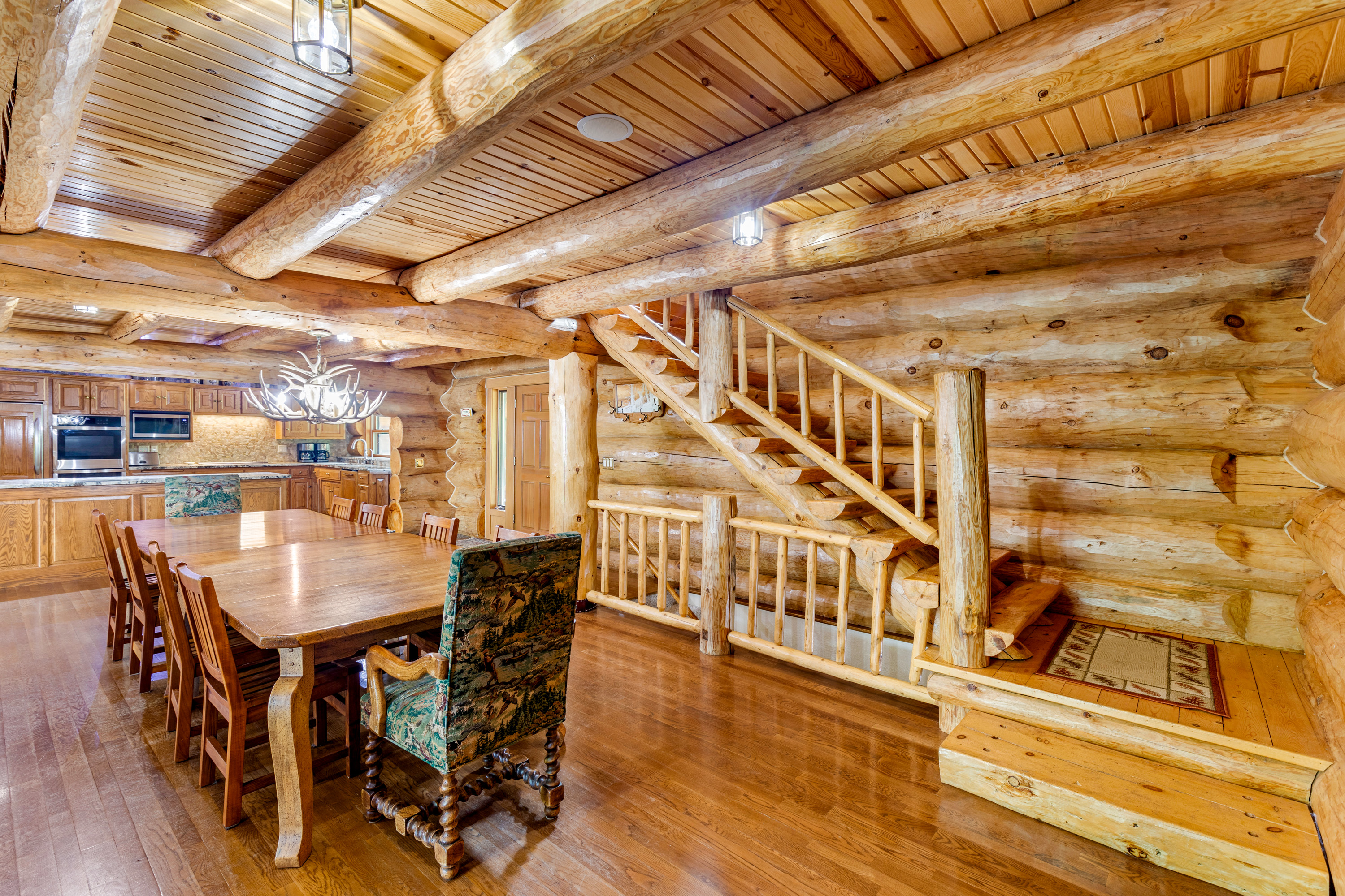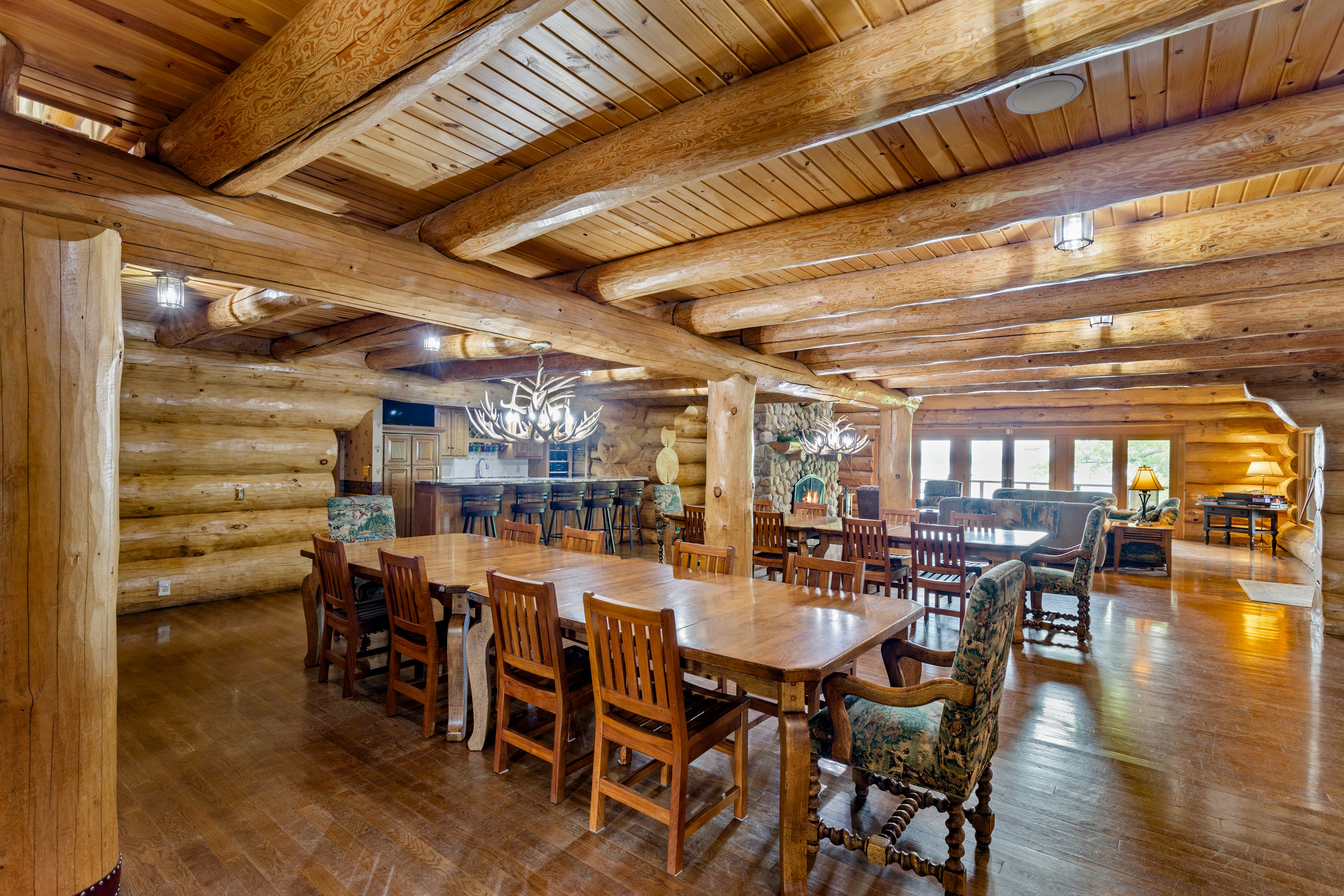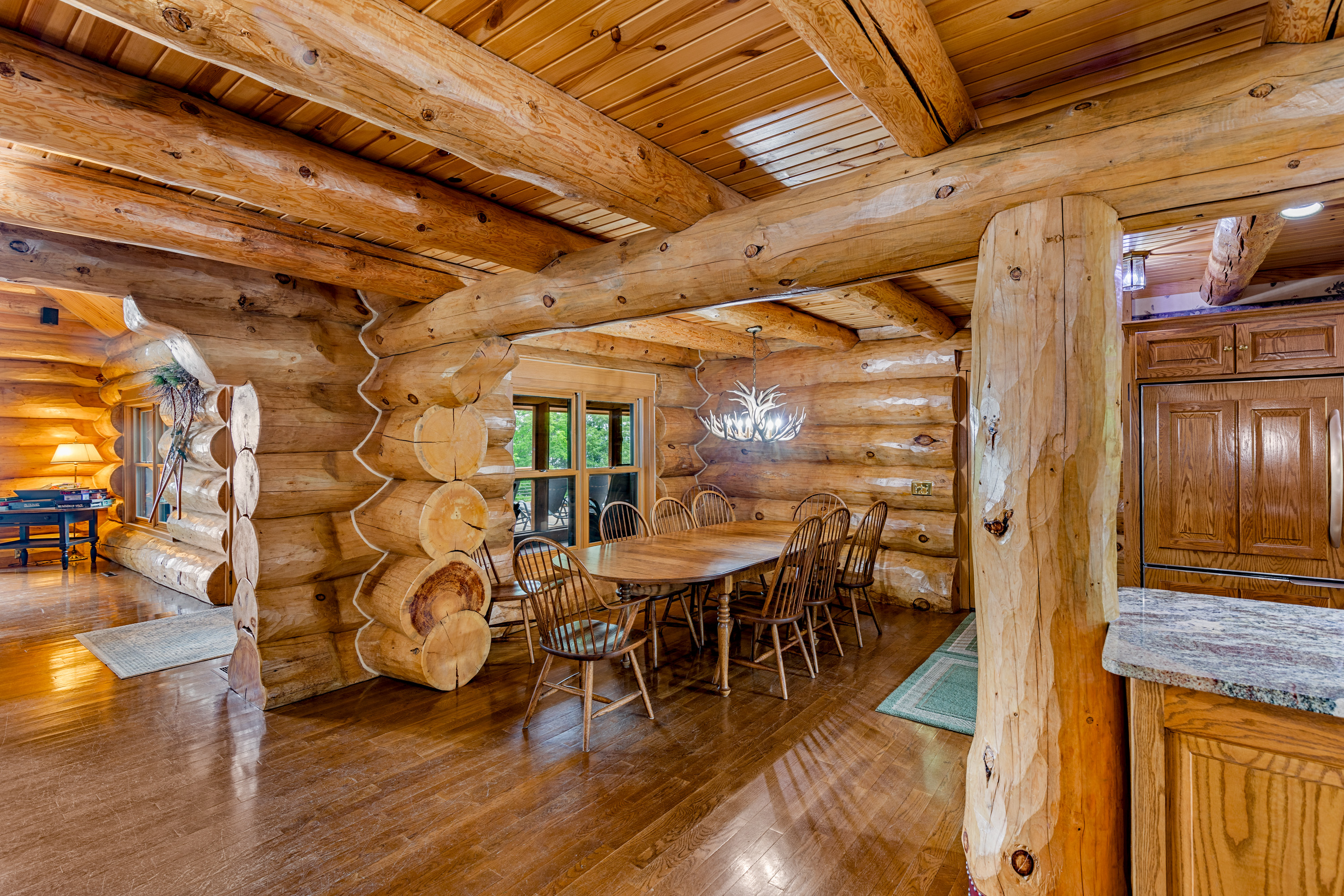 The property originally had several outbuildings and a very large main structure. That structure burned down in the eighties. At that time the property was owned by a business family from the Antigo area. Eventually plans were drawn up to replace the structures with a new main building to be used by the extended family, and for entertaining customers of the business and off-site meetings. There is seating for 20 people in the dining room, with more in the breakfast nook, it was meant to be a comfortable place for larger groups, but it also feels cozy for smaller more intimate get togethers.
