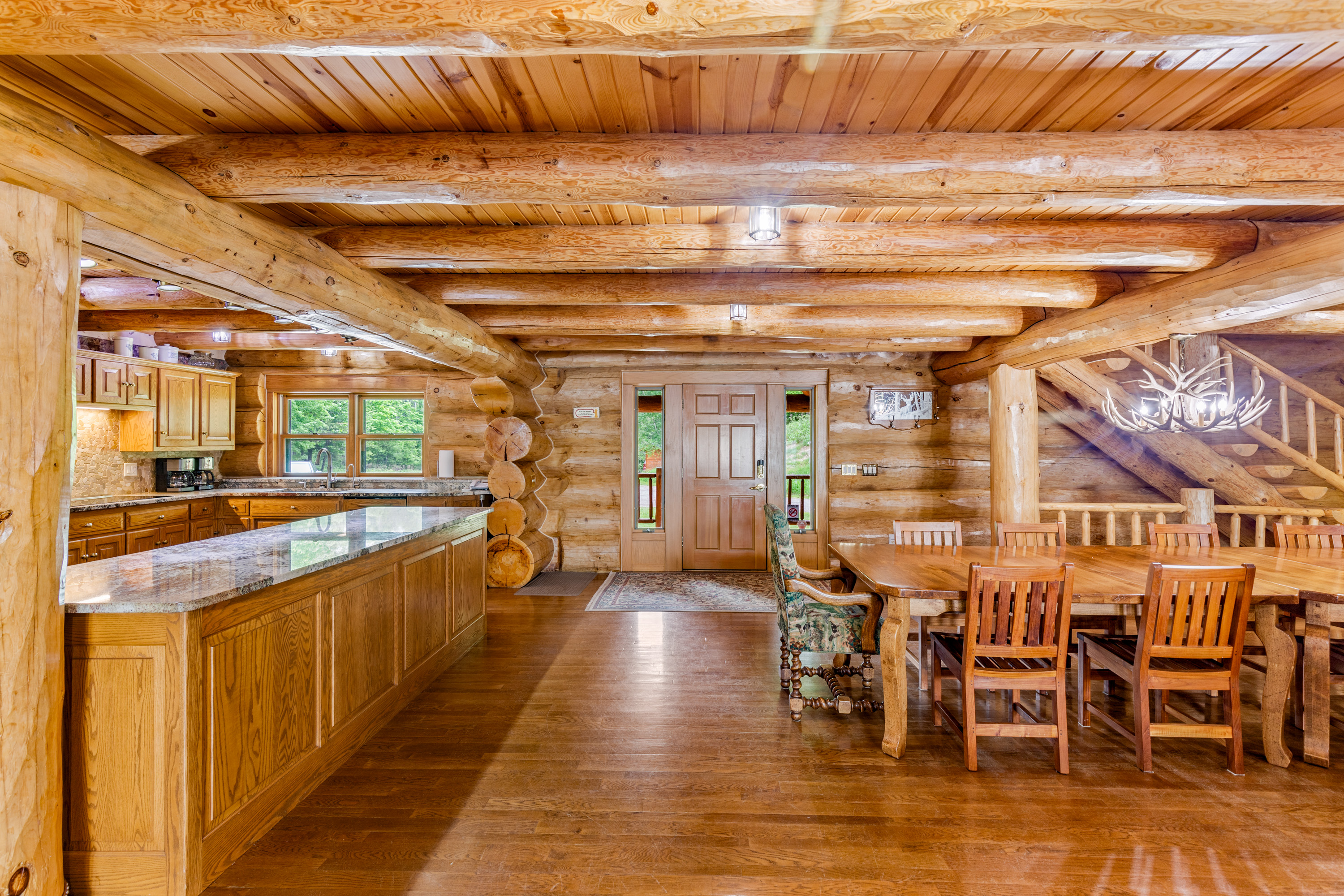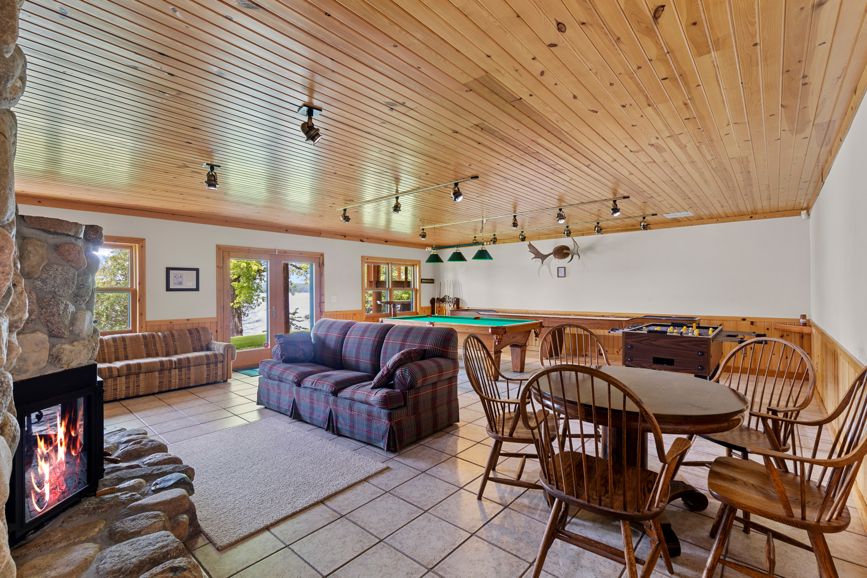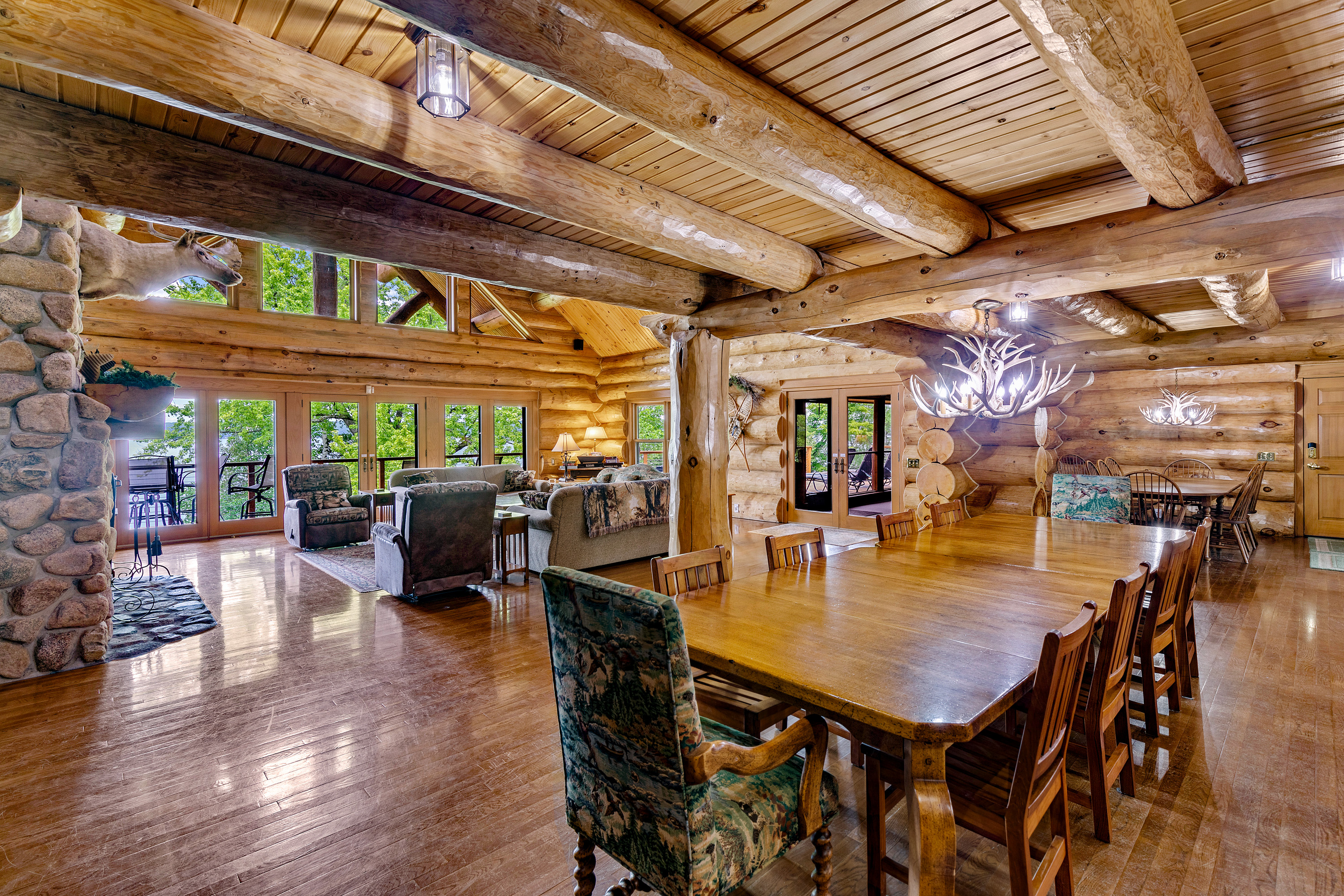 The property originally had several outbuildings and a very large main structure. That structure burned down in the eighties. At that time the property was owned by a business family from the Antigo area. Eventually plans were drawn up to replace the structures with a new main building to be used by the extended family, and for entertaining customers of the business and off-site meetings. There is seating for 20 people in the dining room, with more in the breakfast nook, it was meant to be a comfortable place for larger groups, but it also feels cozy for smaller more intimate get togethers.