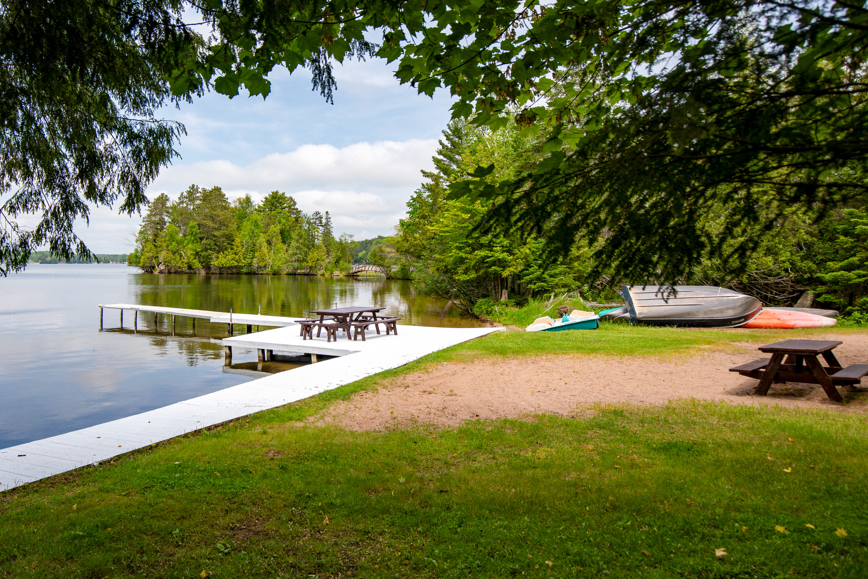 There is a sandy beach at the dock area and from there the sandy bottom continues out and around the island. In the summer boats will anchor around the island as it provides some of the best swimming on the lake.